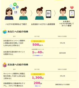 ハピタスには紹介制度があり、紹介した友達が会員登録し、ポイントを獲得すると、紹介者と友達それぞれに特典ポイントがプレゼントされます。