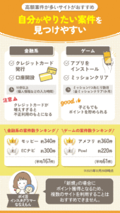 - クレジットカード発行や証券口座開設などの案件では、一度に数千円分のポイントを獲得できます。