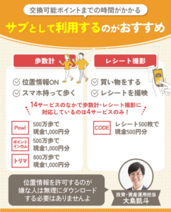 このような機能は他のポイントサイトでも対応しているところが少ないため、大きなデメリットとは言えませんが、歩数計やレシート撮影を活用してポイントを貯めたい方には向いていないかもしれません。