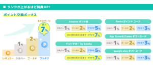 例えば、ゴールドやプラチナランクになると、VポイントやAmazonギフトカードの交換時に最大5%のボーナスがつきます。