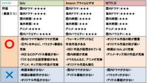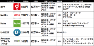 | Netflix | Amazonプライム | Hulu | U-NEXT | |