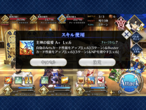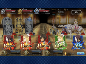バトル開始時に、サーヴァント3体が選ばれ、バトルカードがランダムで配られます。配られたカードの中から、プレイヤーは3枚を選択して戦闘を進めます。カードには、Buster、Arts、Quickの3種類があり、それぞれに特徴があります。 -