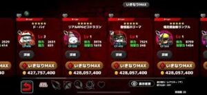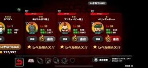 仲間のレベルアップは、小判を消費して行います。レベルが上がると体力や攻撃力がアップし、戦闘がぐっと楽になります。さらに、レベルが20に達すると「進化」が可能になり、見た目も性能もパワーアップ!