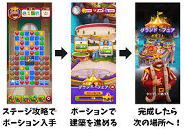 パズルをクリアして得られるポーションを使うことで、城や施設を建設できます。これは単なる装飾ではなく、ゲームの世界観やストーリーと密接にリンクしています。